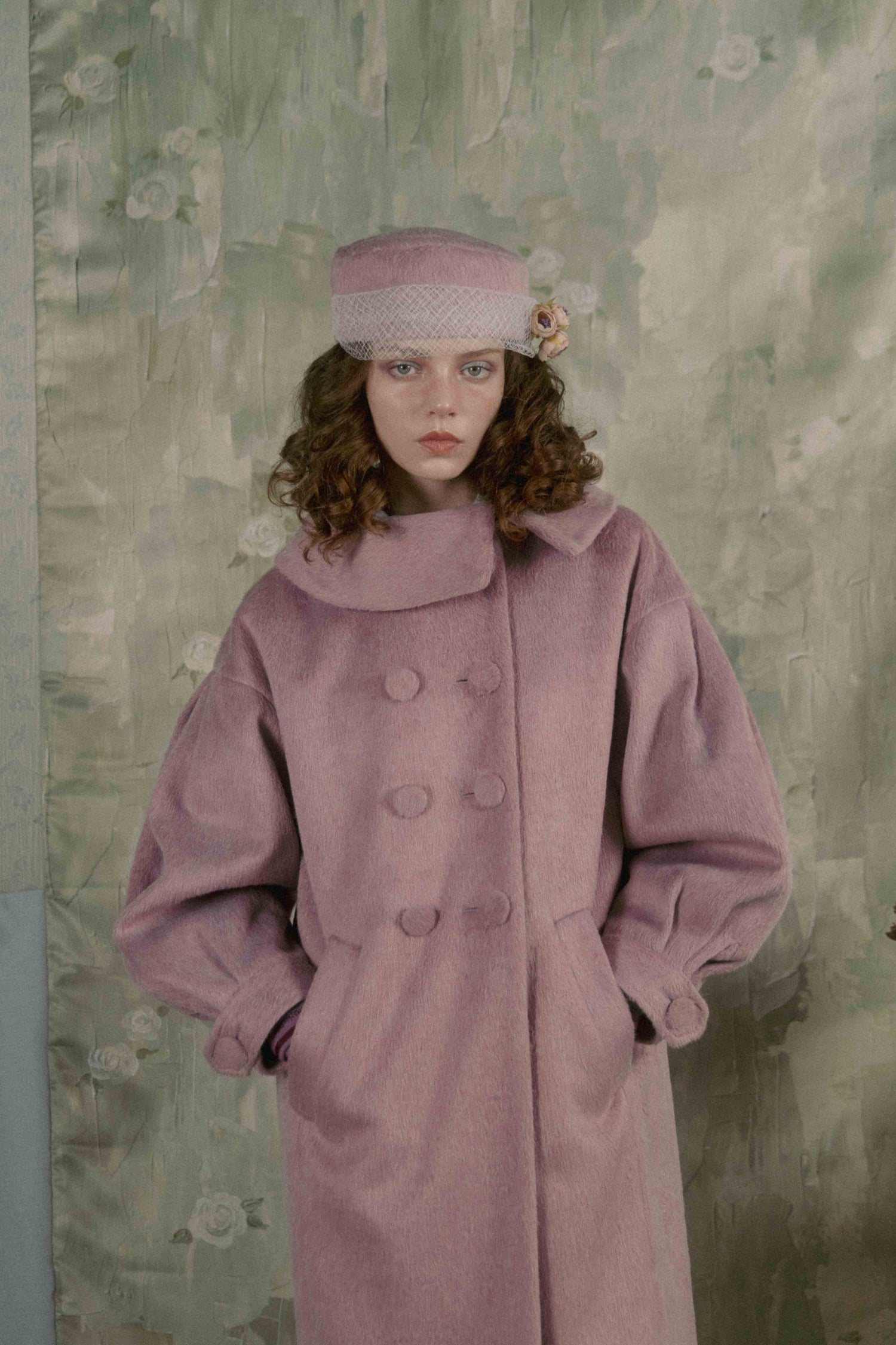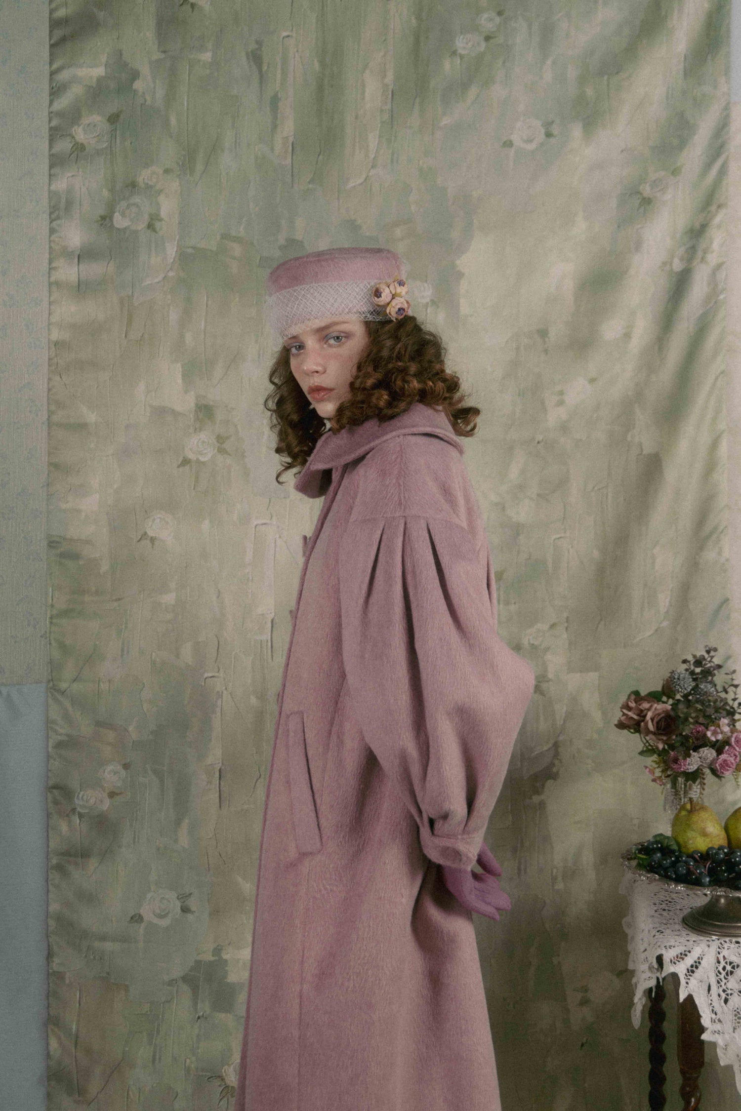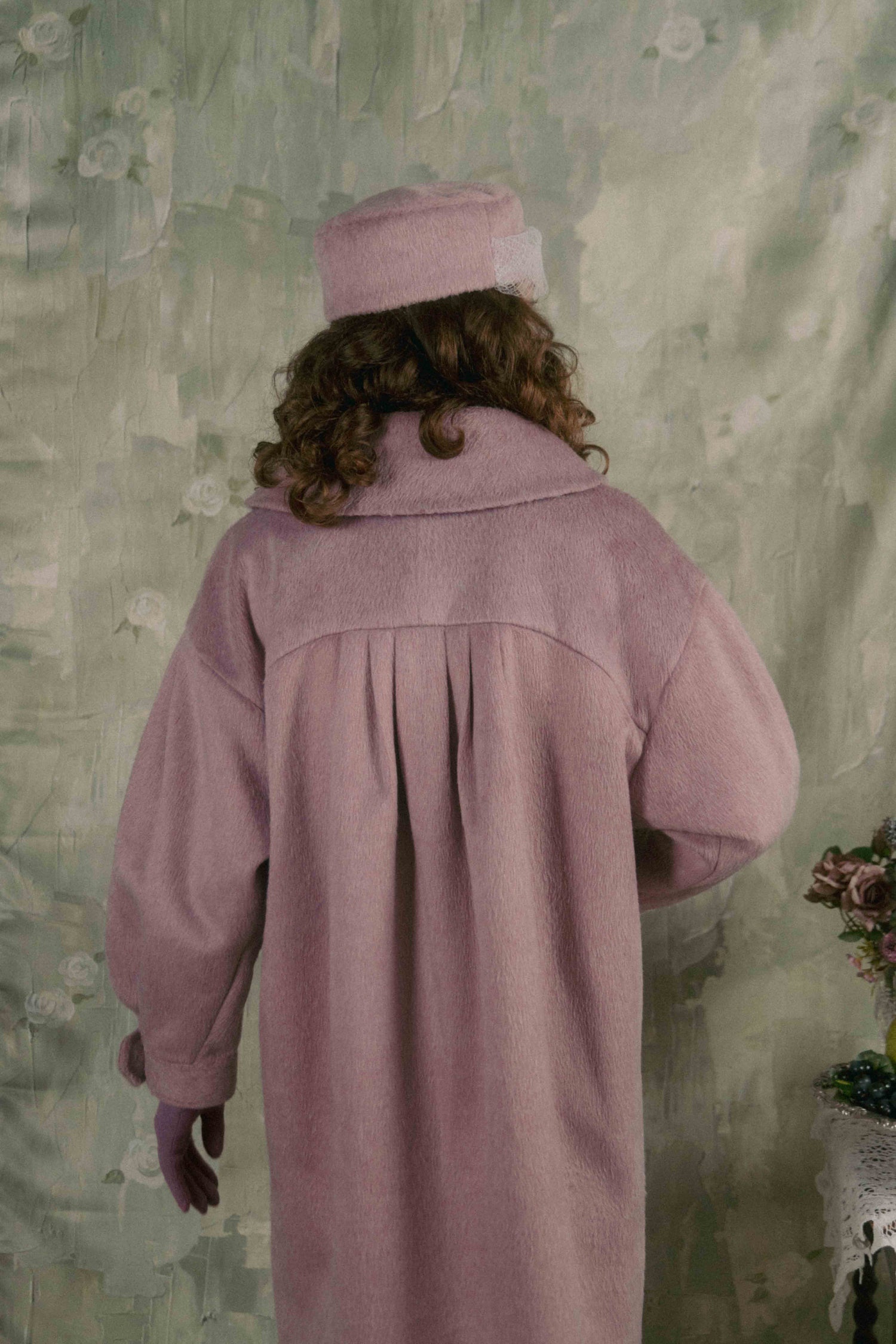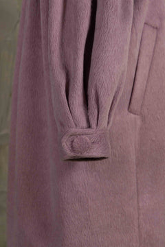 Soft gathers along the sleeves and back create a gentle cocoon silhouette, giving the piece a voluminous, unmistakable presence.