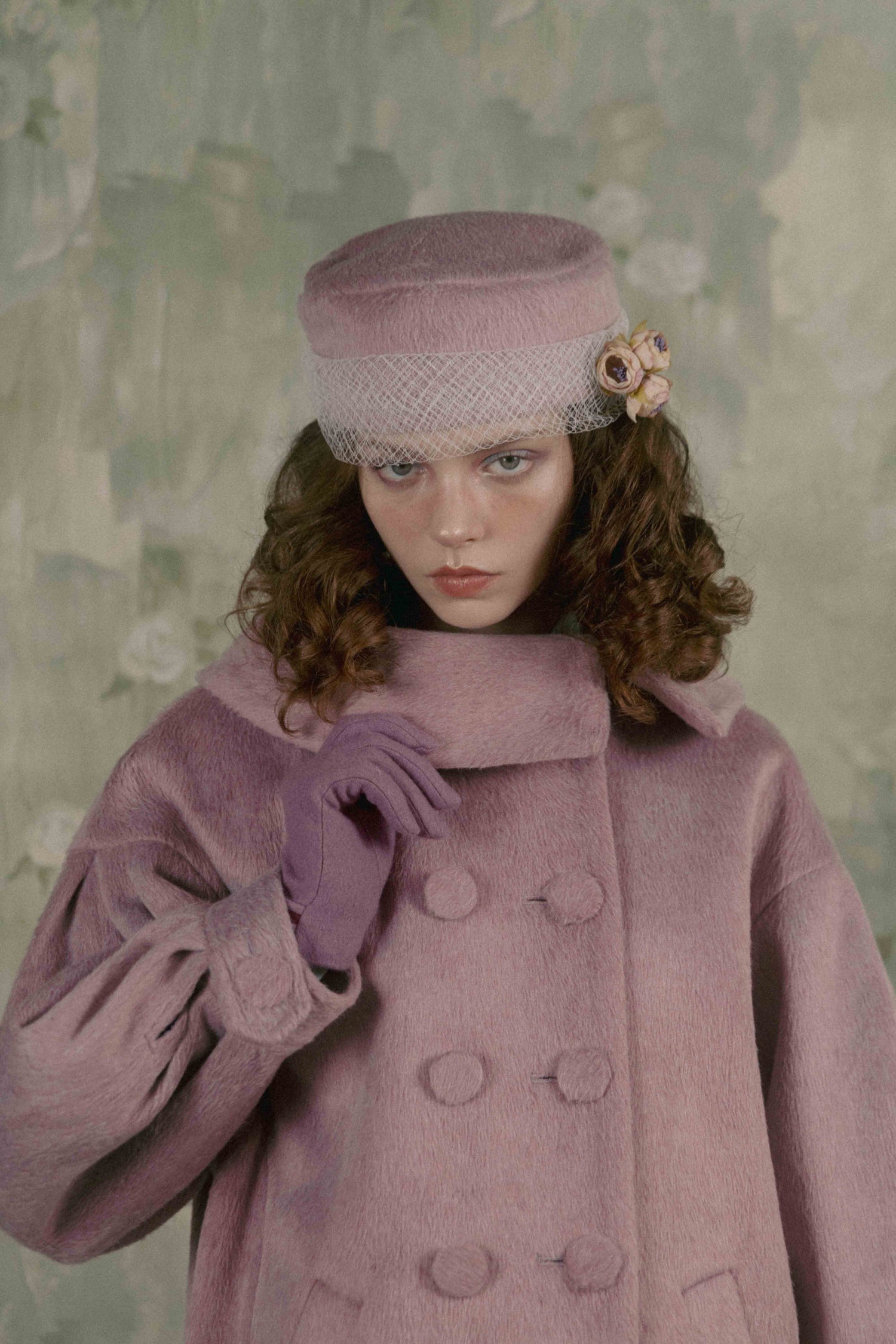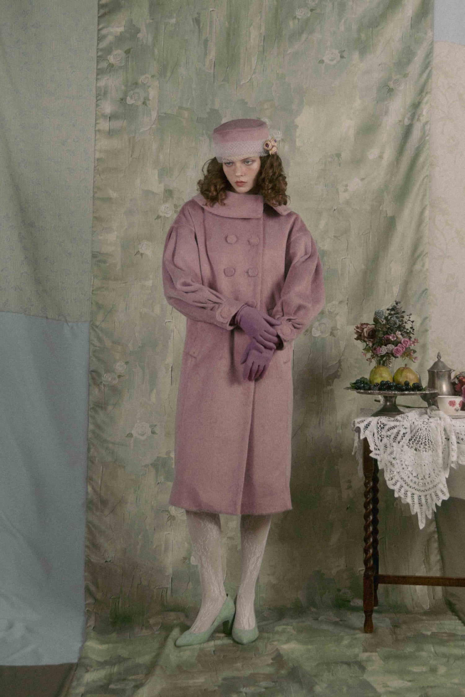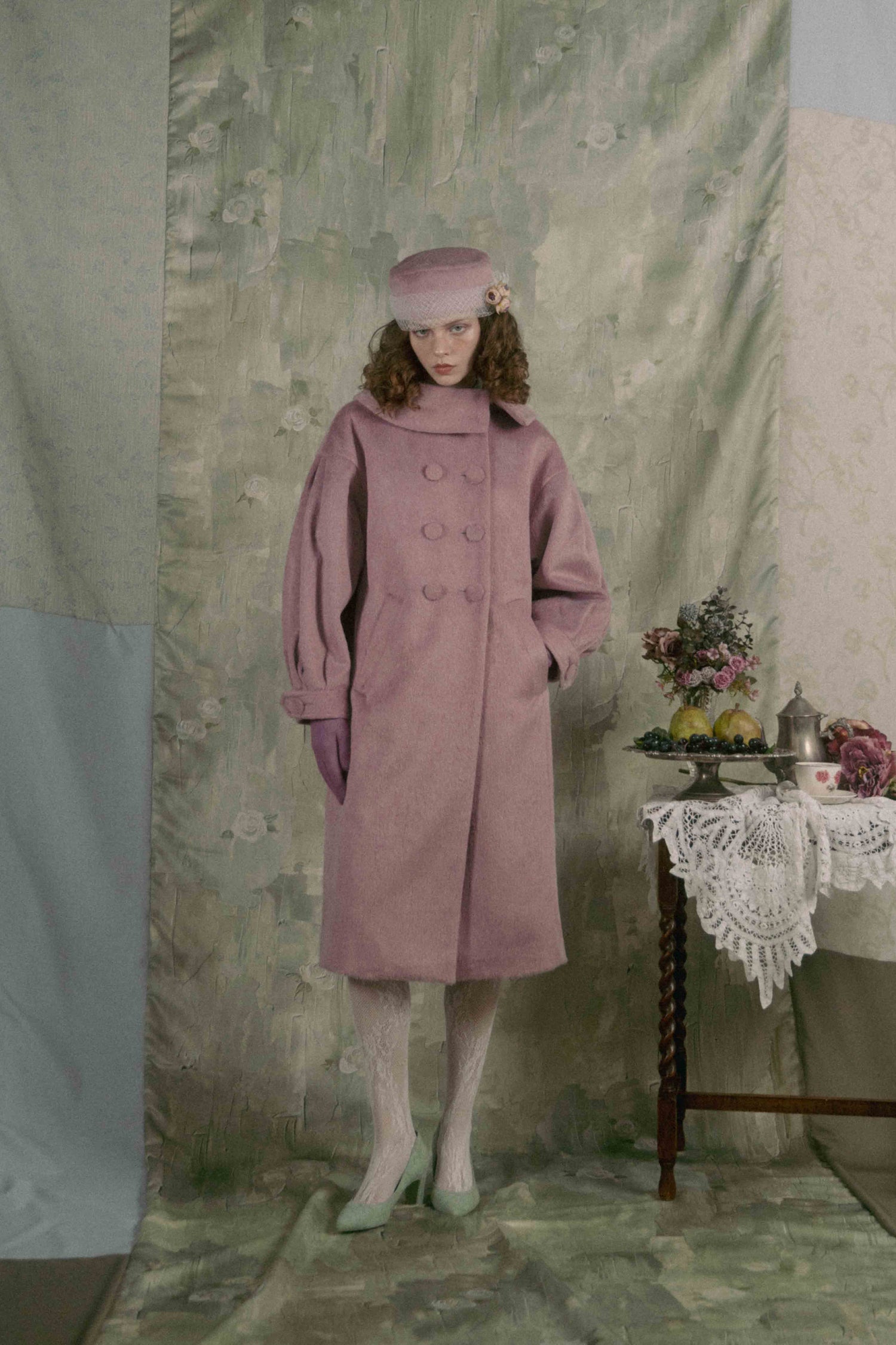 Soft gathers along the sleeves and back create a gentle cocoon silhouette, giving the piece a voluminous, unmistakable presence.