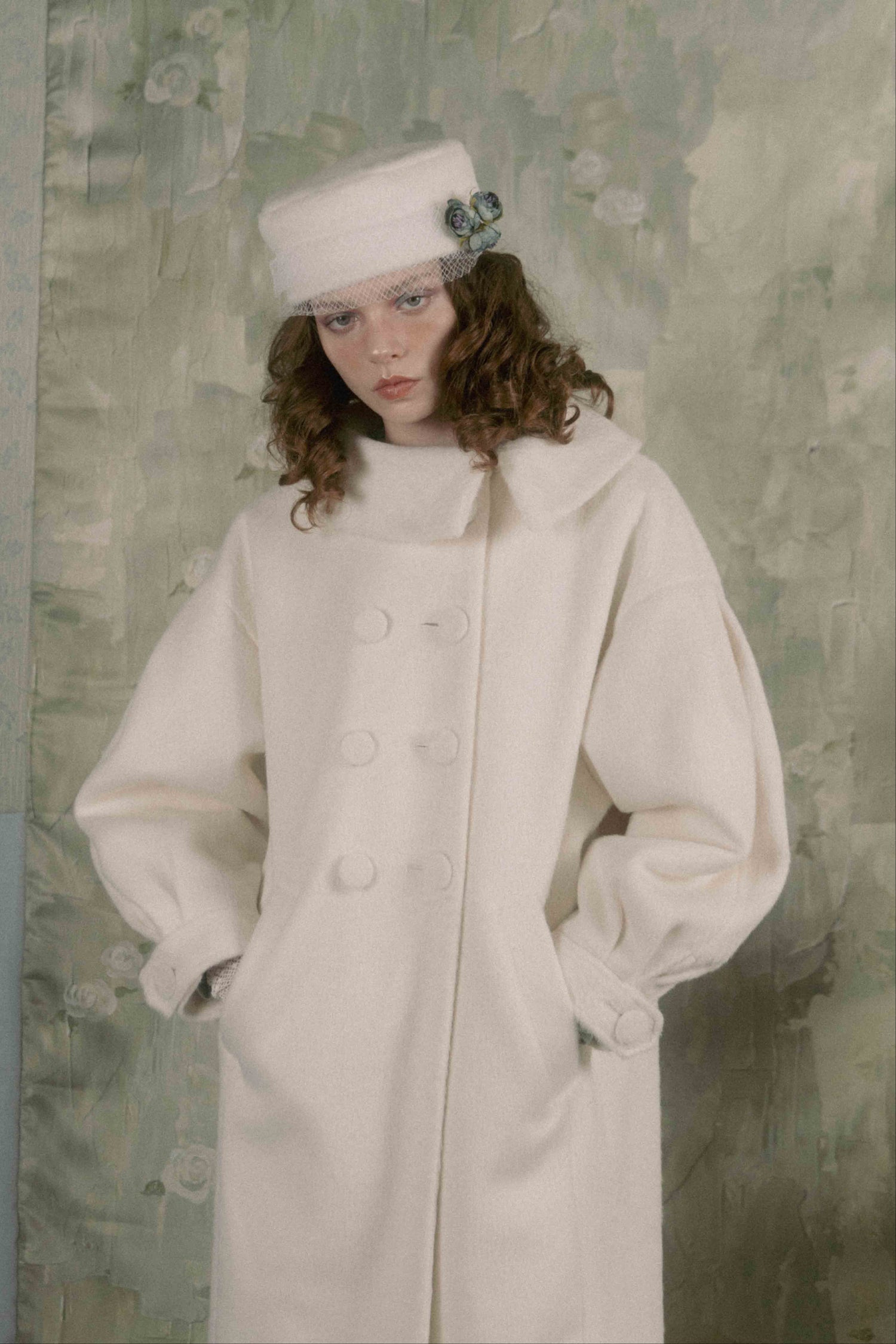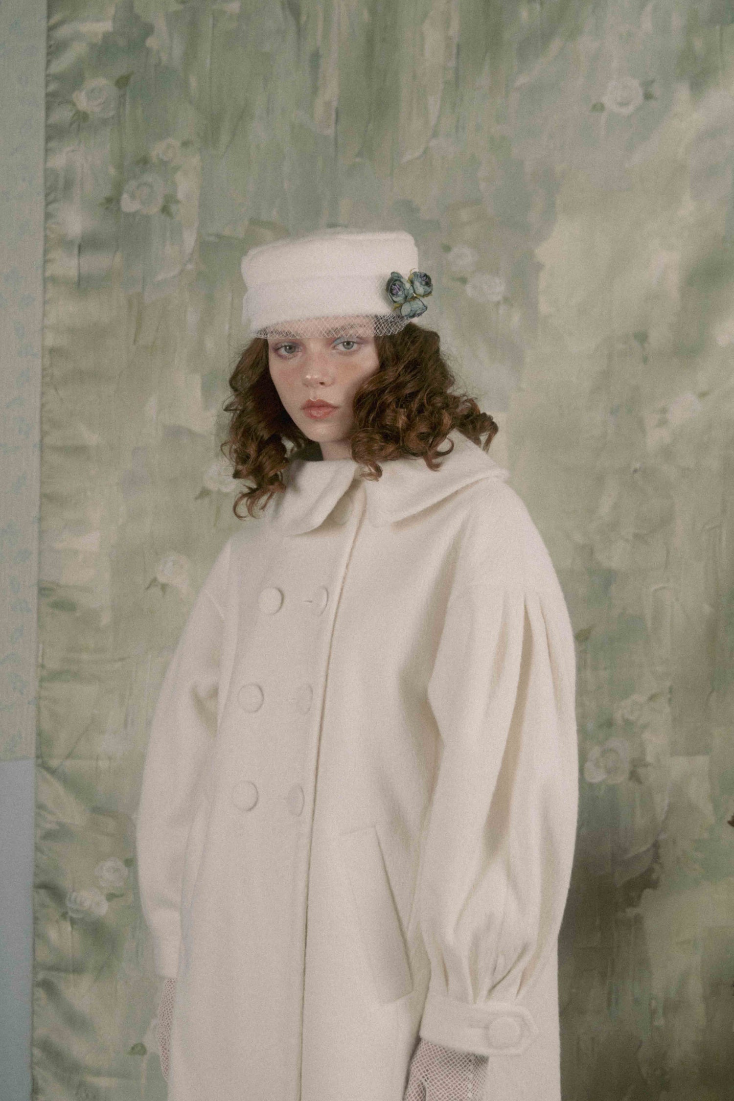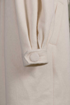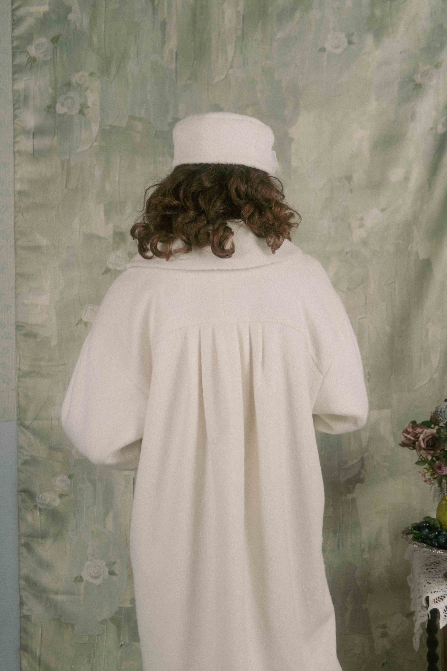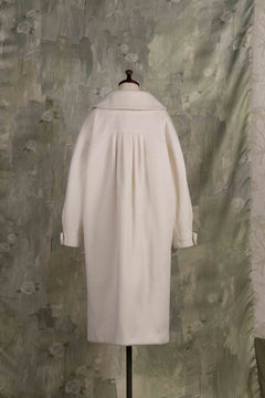 Soft gathers along the sleeves and back create a gentle cocoon silhouette, giving the piece a voluminous, unmistakable presence.
