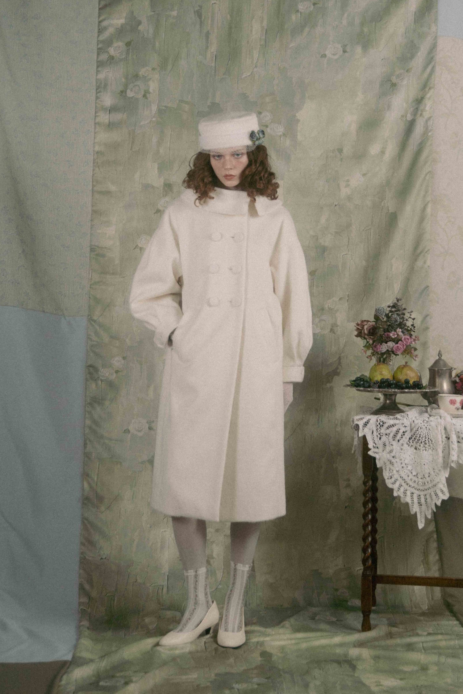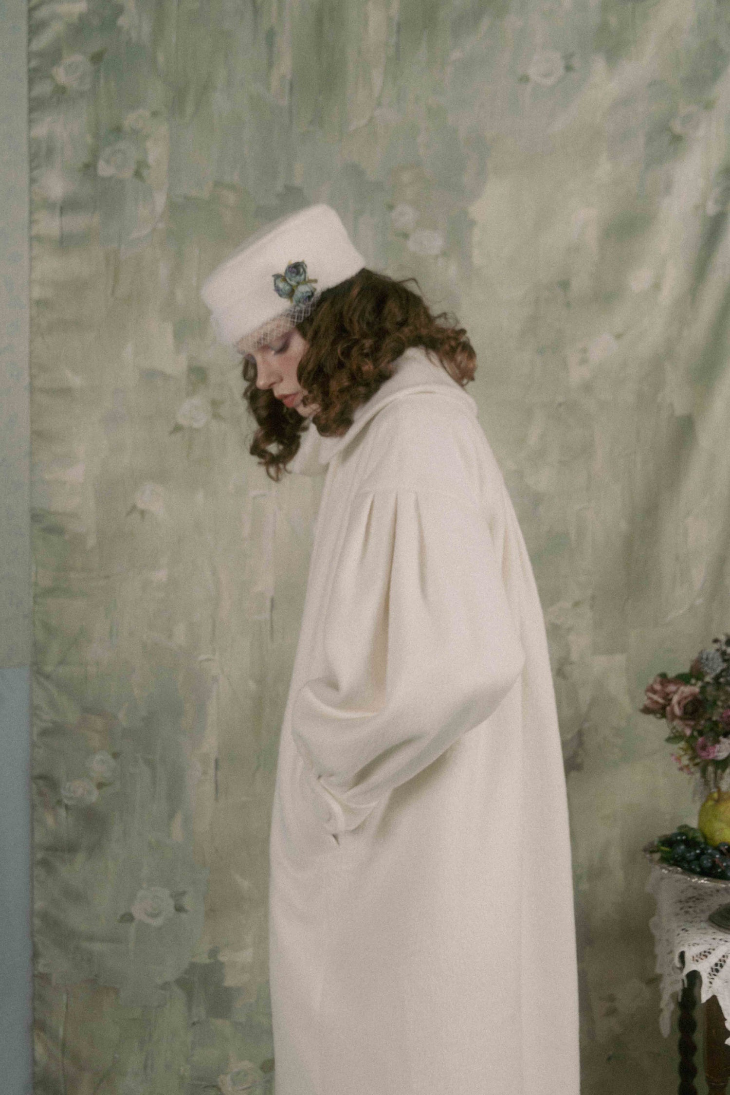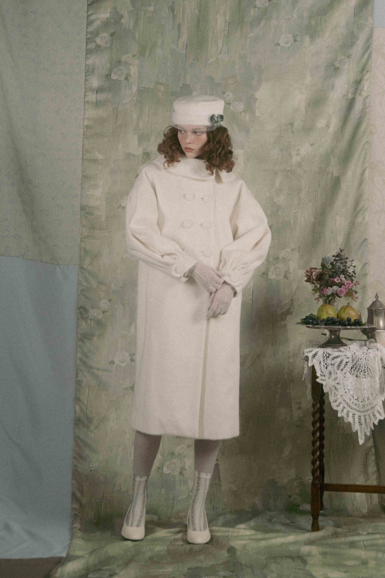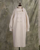 Soft gathers along the sleeves and back create a gentle cocoon silhouette, giving the piece a voluminous, unmistakable presence.