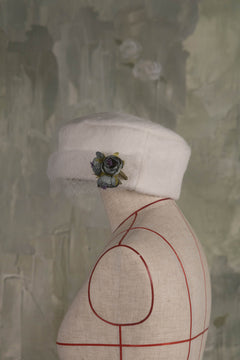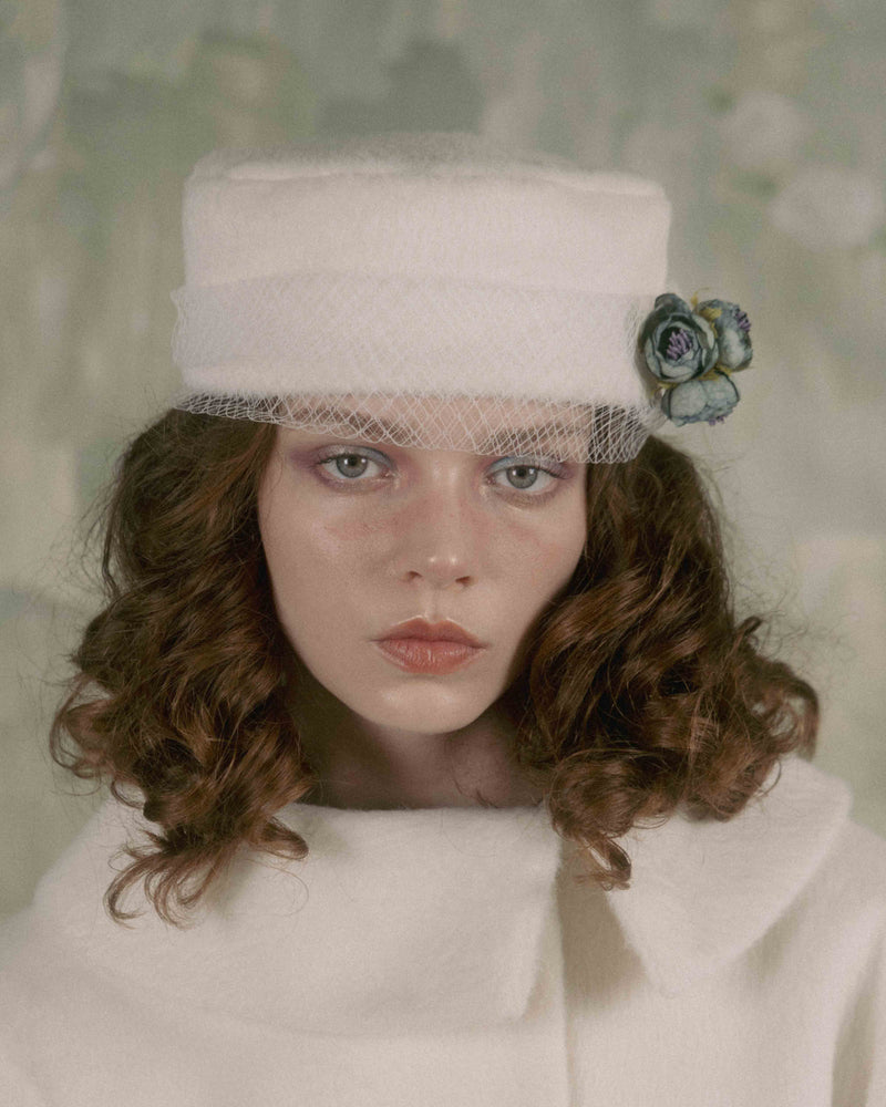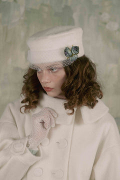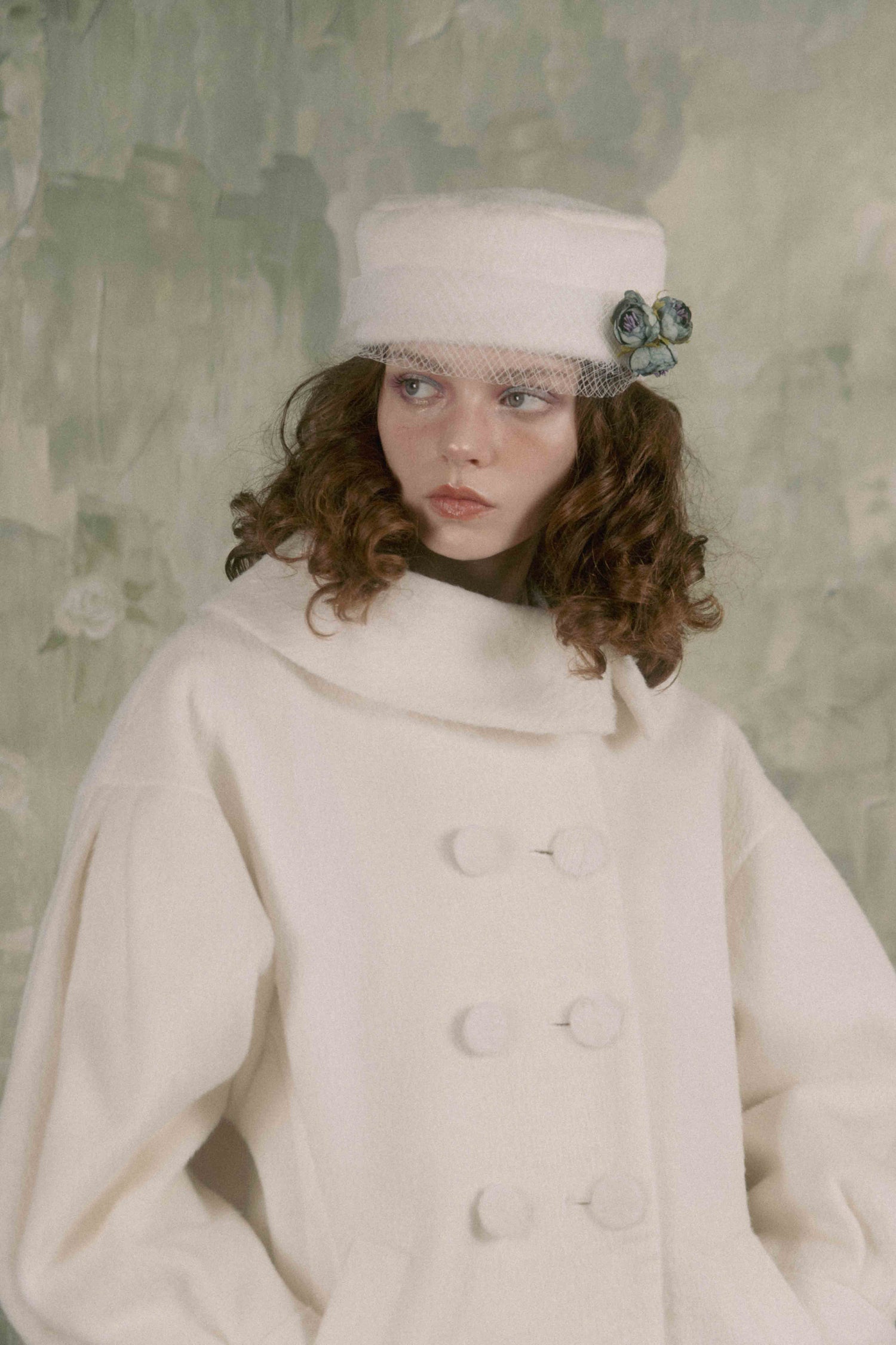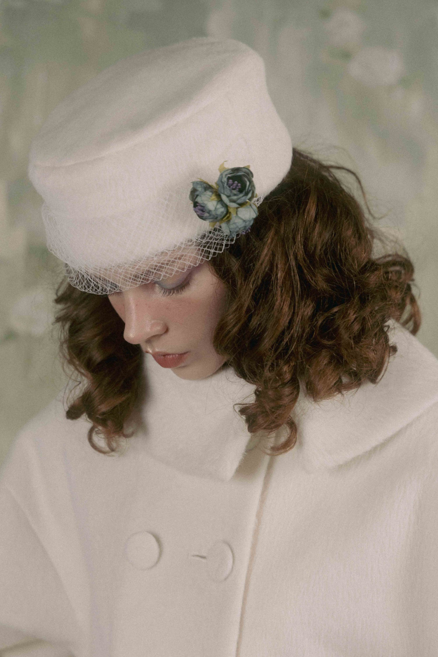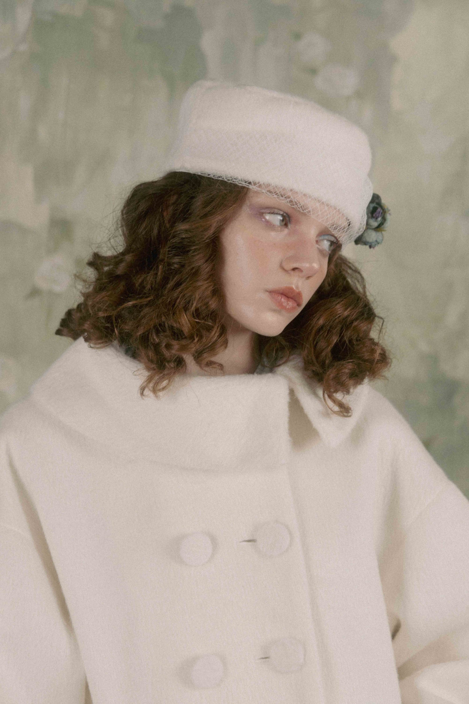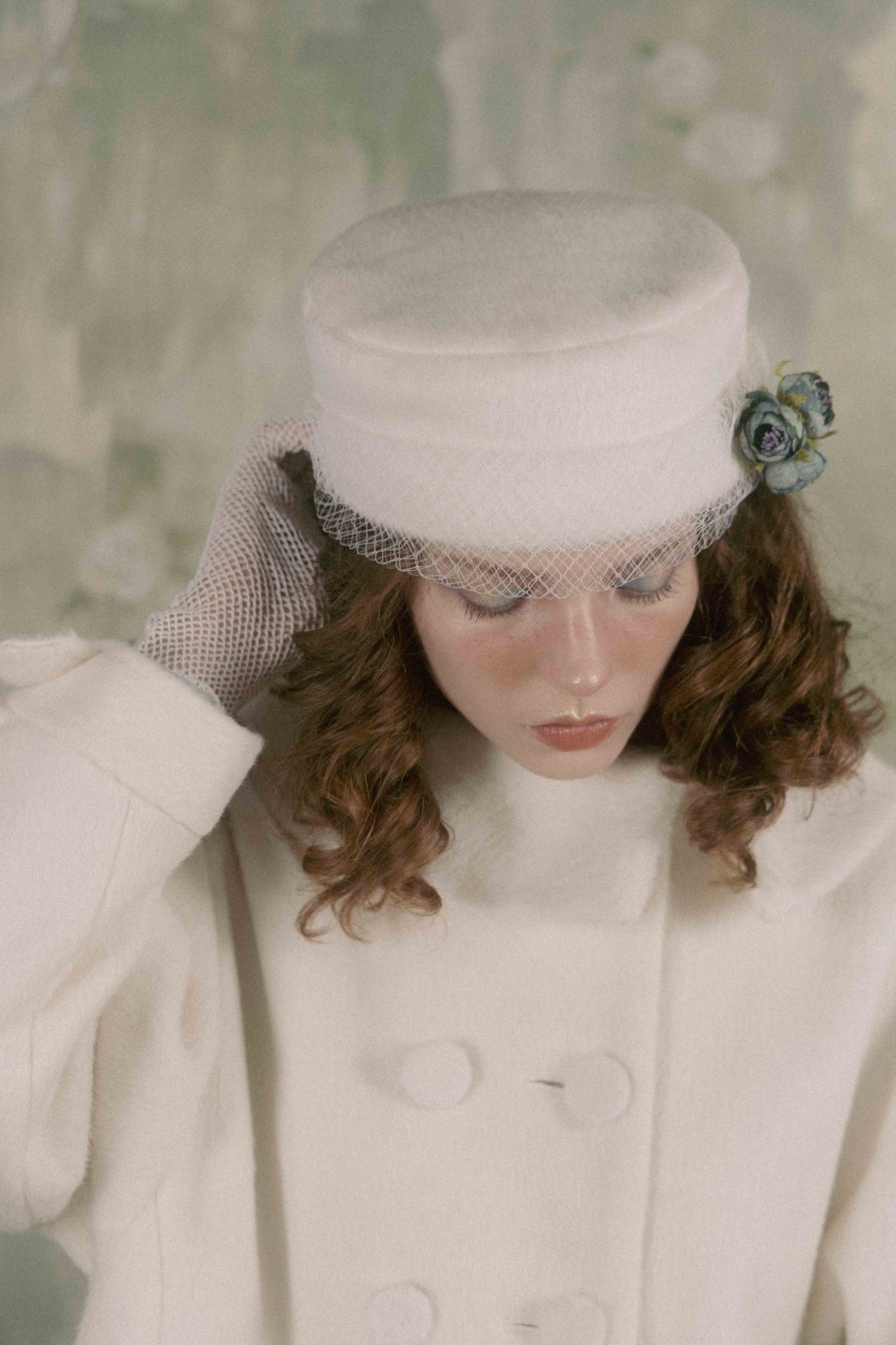 This hat is crafted from the same fabric as the coat, creating a cohesive and classical look.