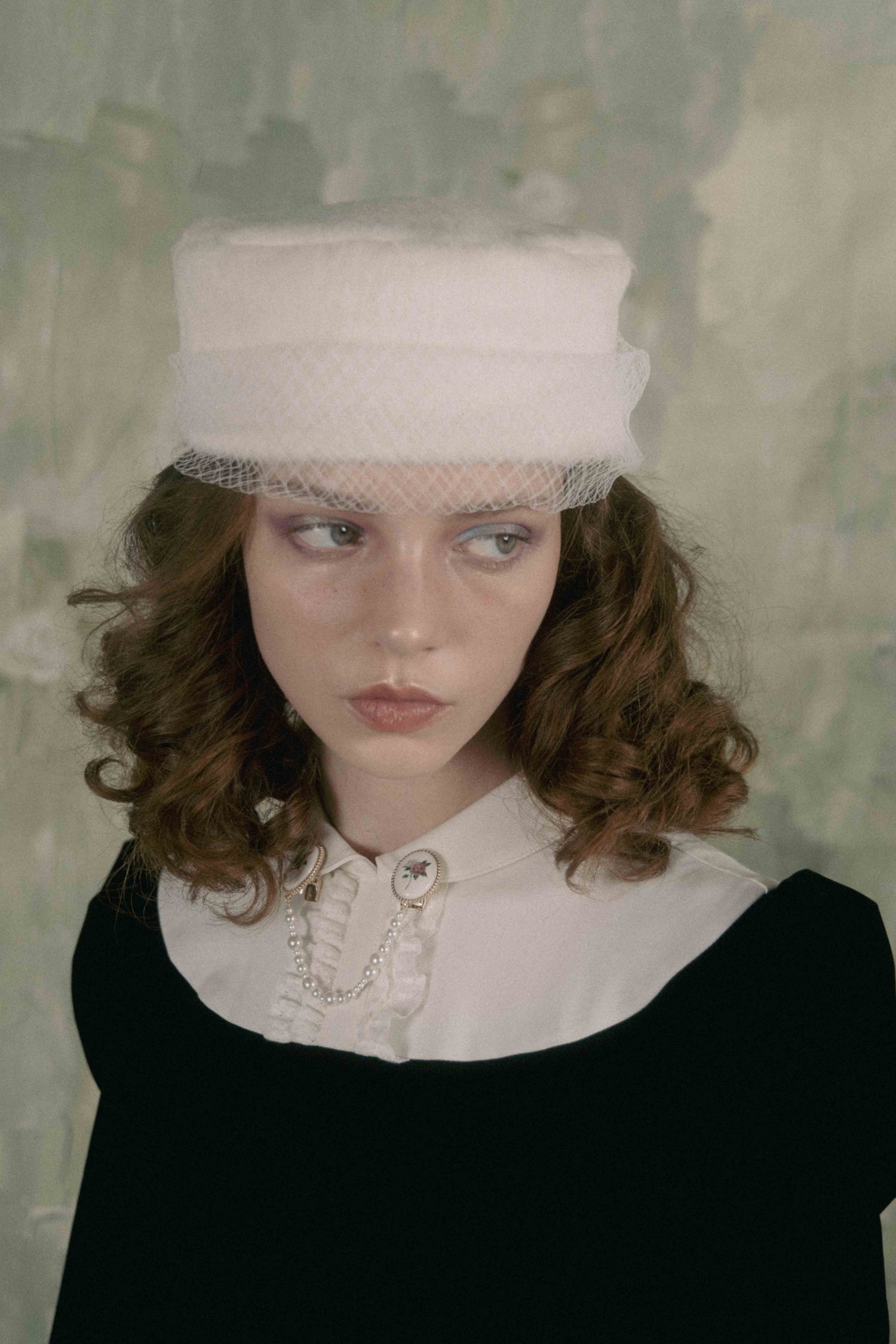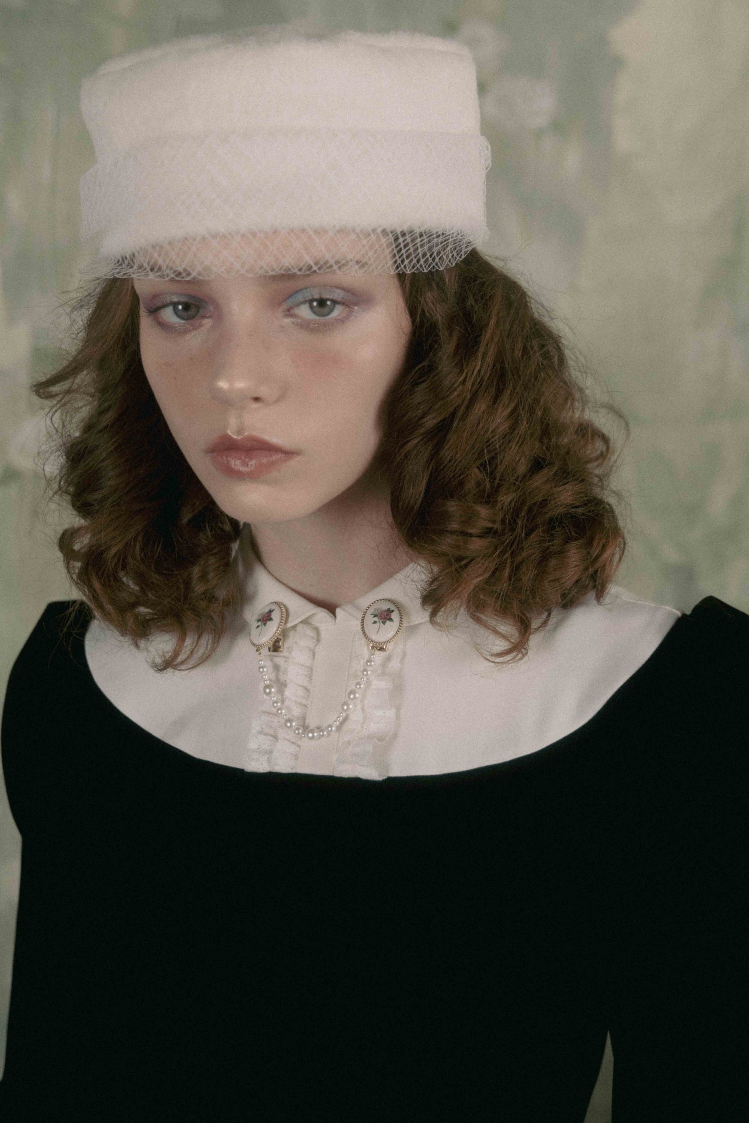 Its structured silhouette is softly overlaid with tulle, adding an elegant, vintage-inspired mood to any outfit.
