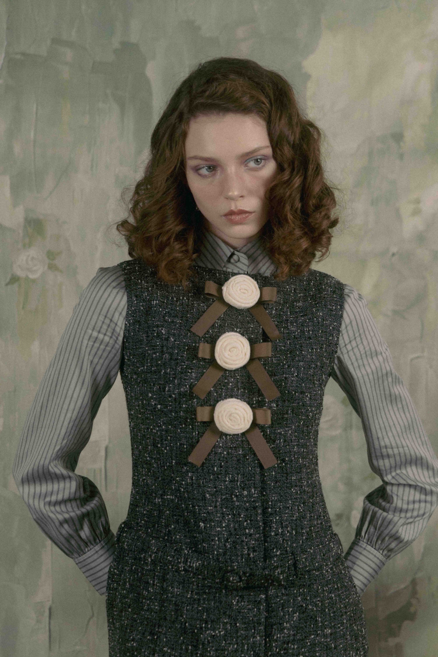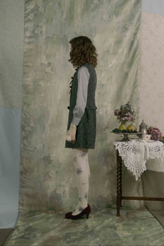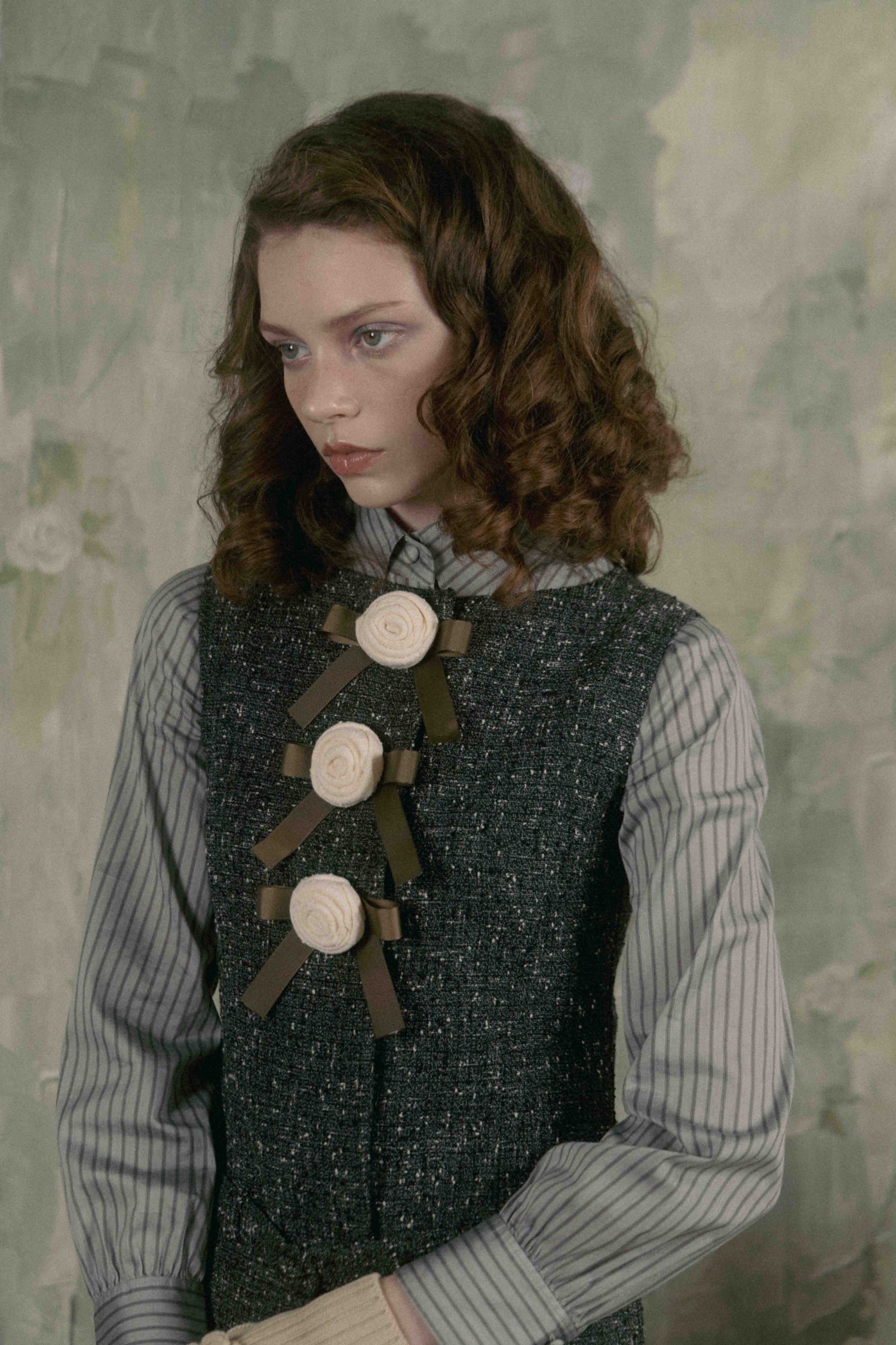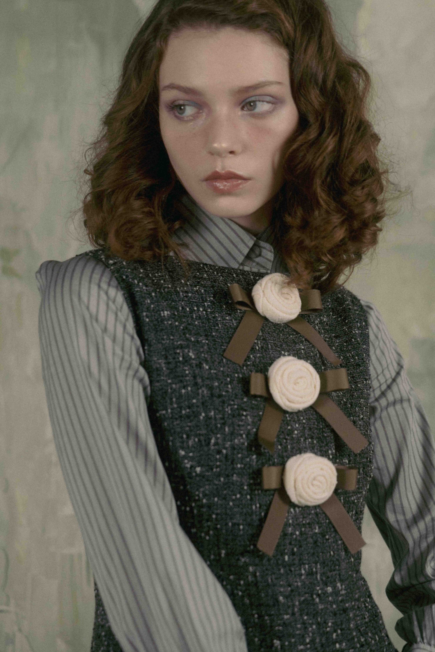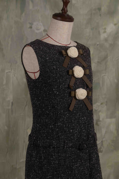 This mini dress features a charming and eye-catching design with three-dimensional roses and green ribbons inspired by leaves.