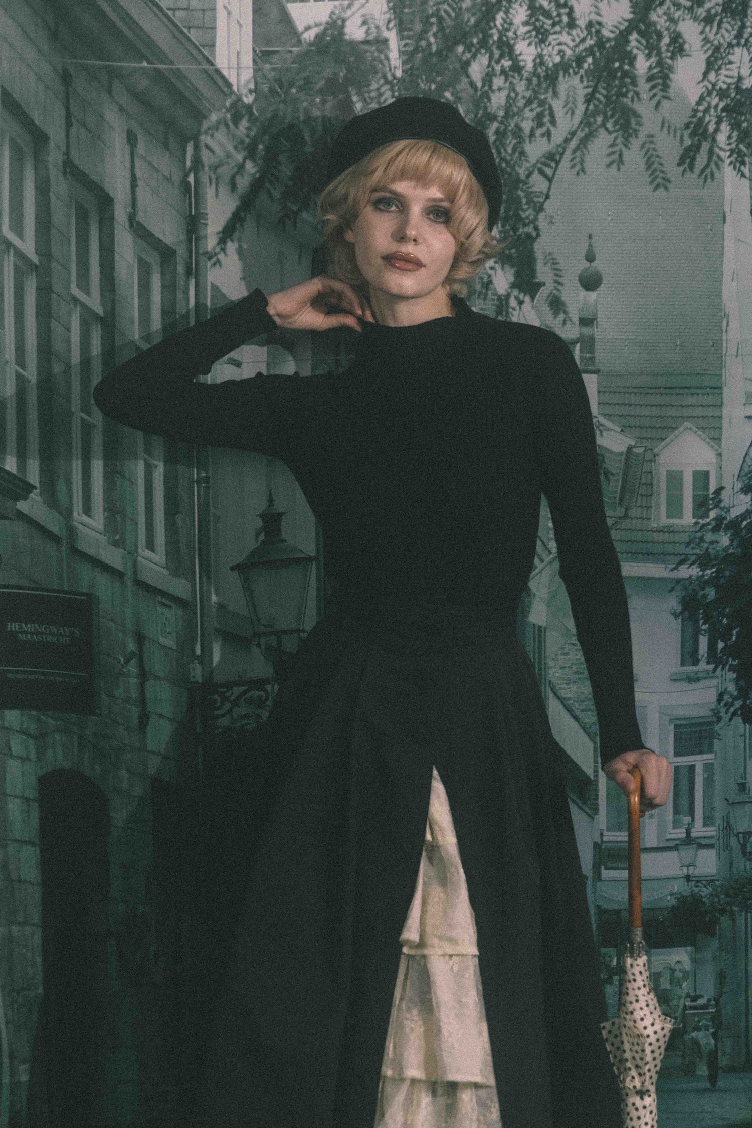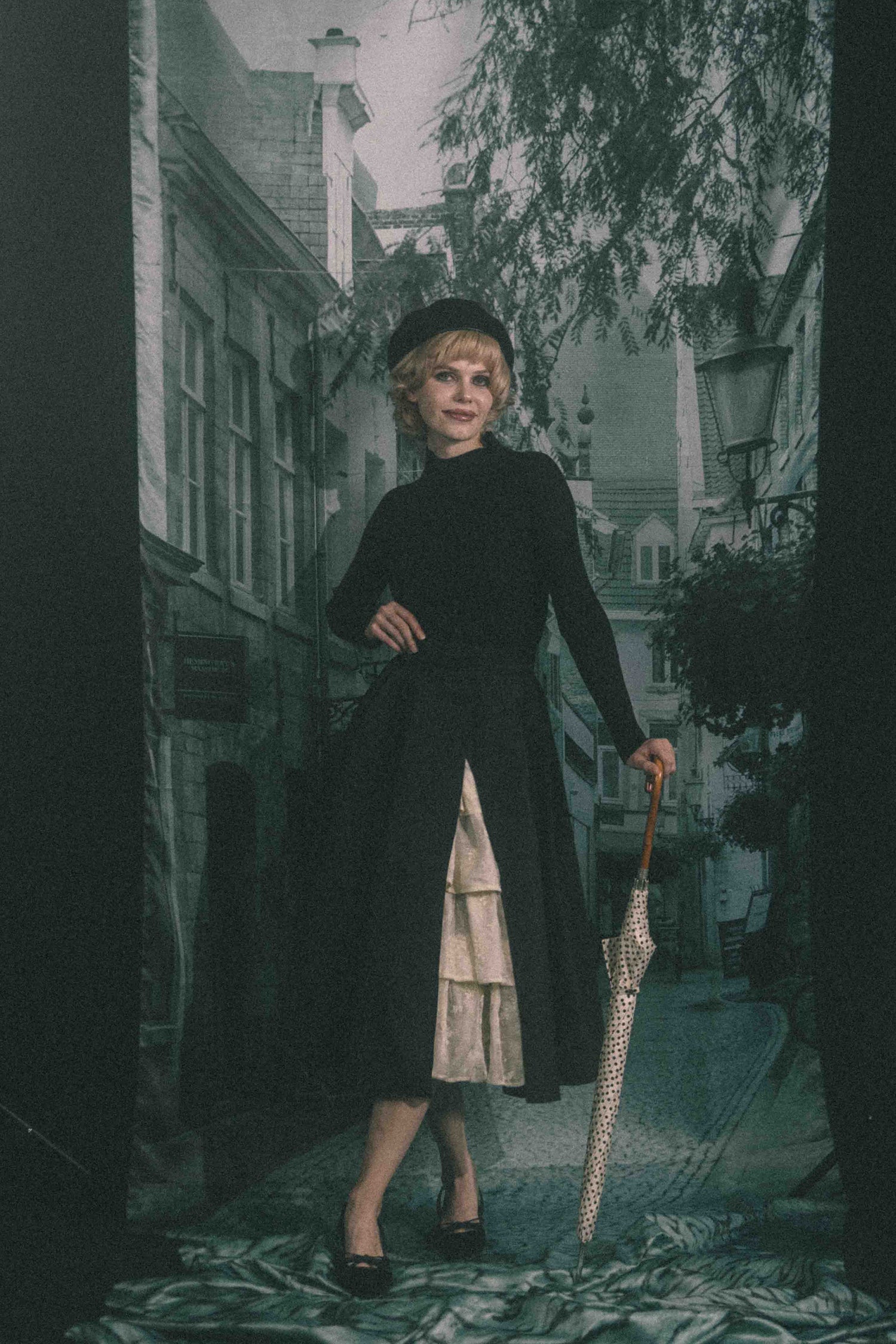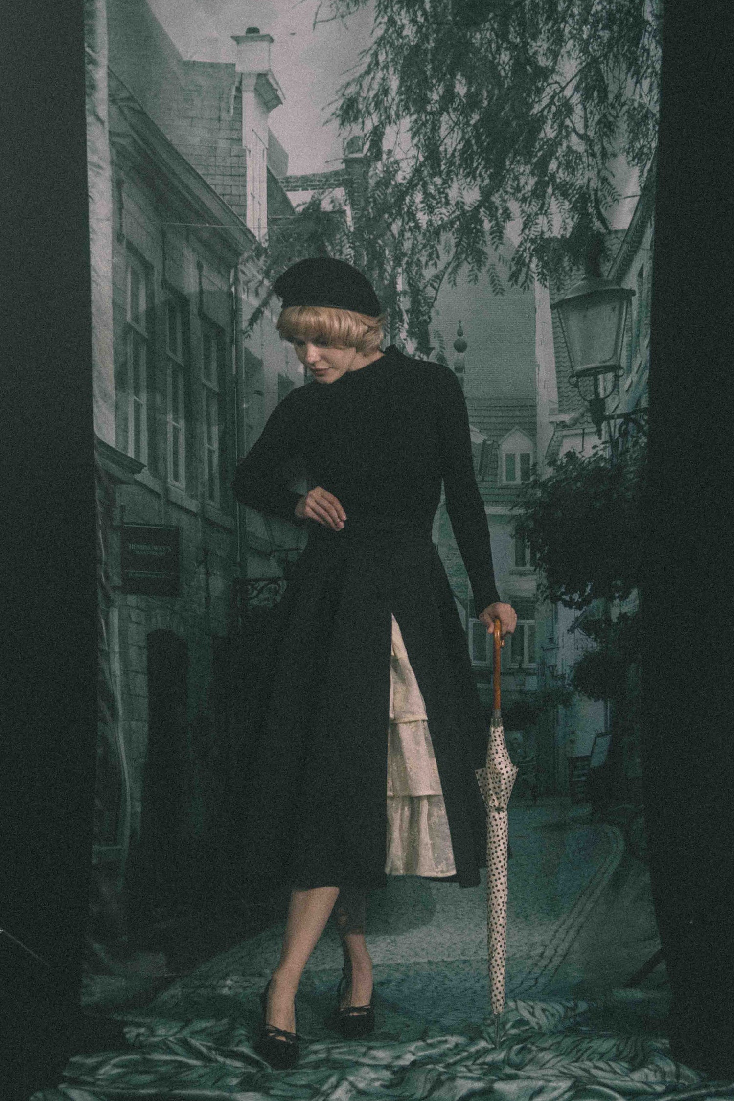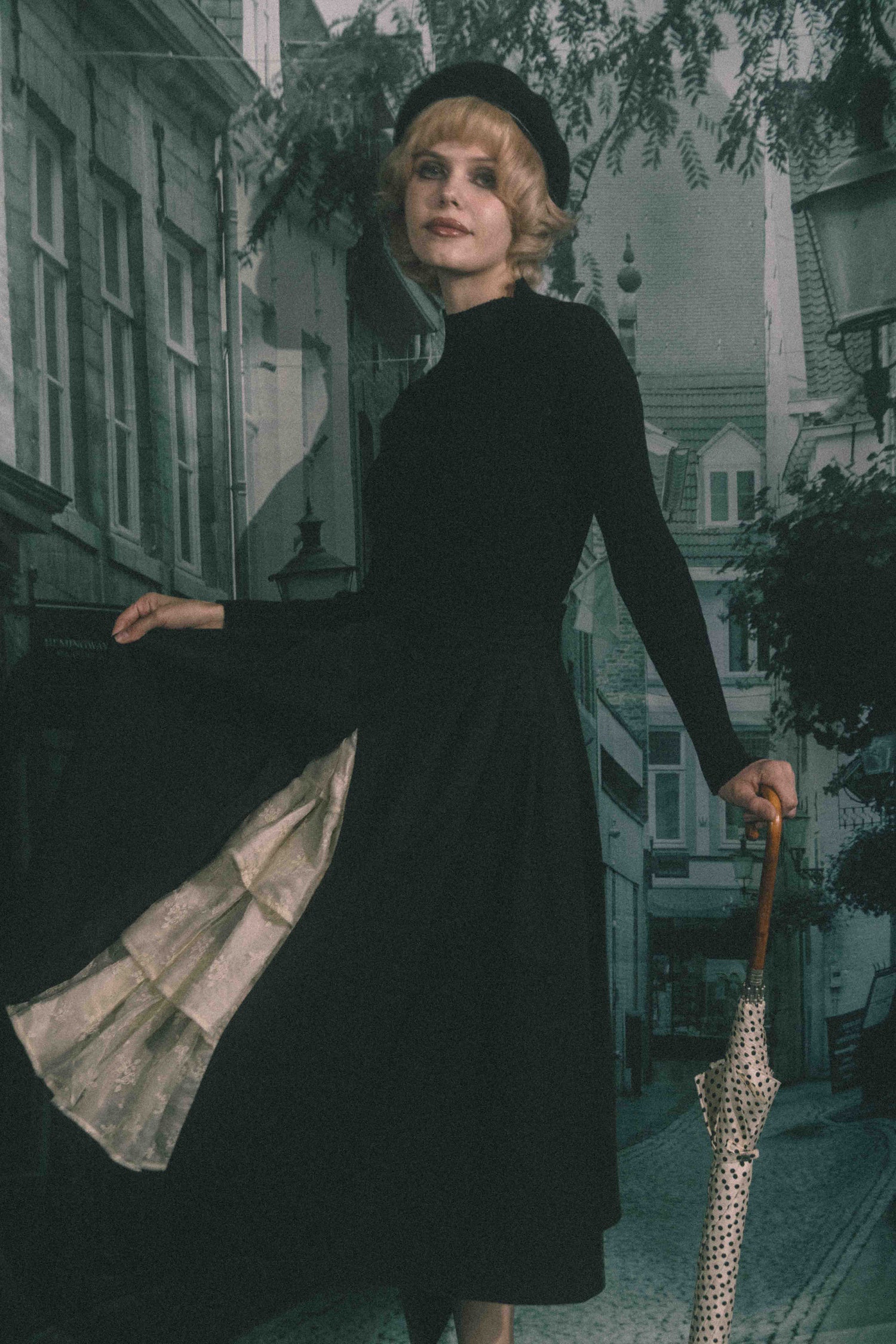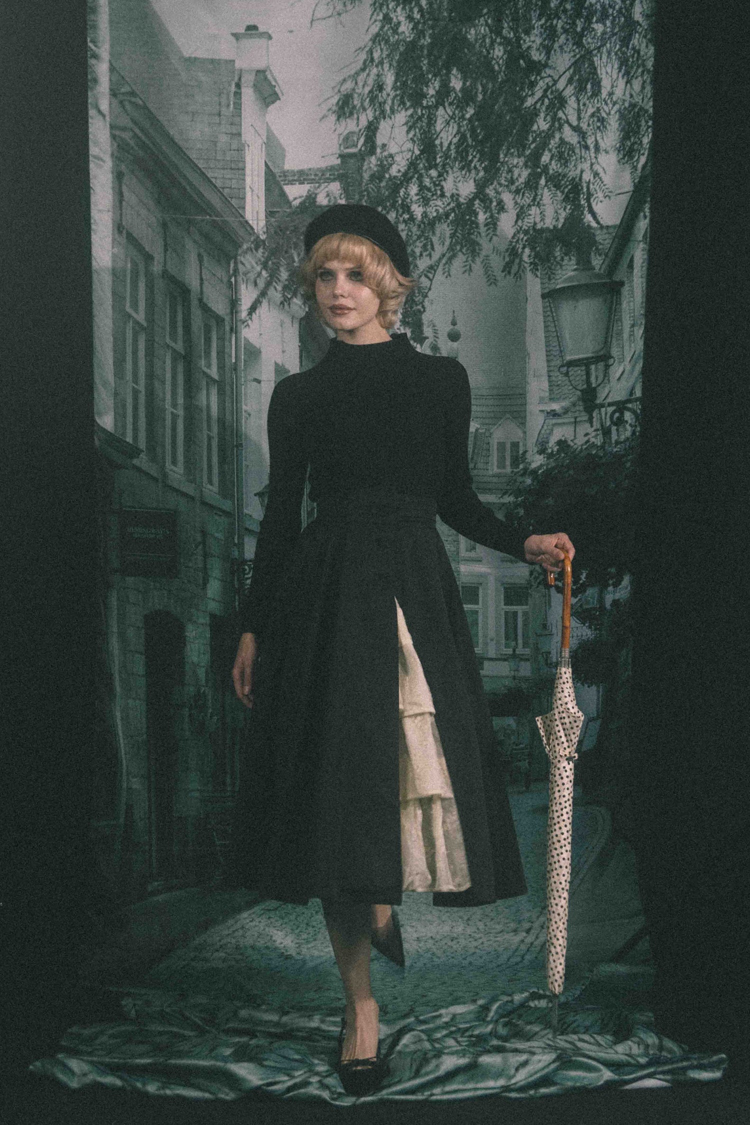 ロマンティックなムードを添えながら、くるみボタンとウエストのギャザーがクラシカルな印象を演出します。