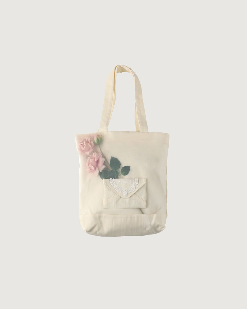 バラの造花と手紙風ポケットがポイントのトートバッグ。