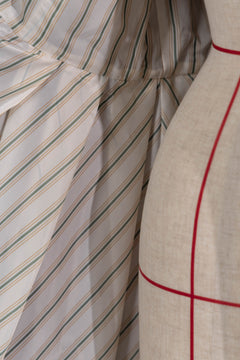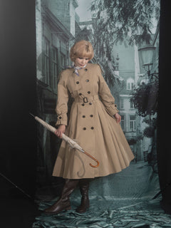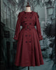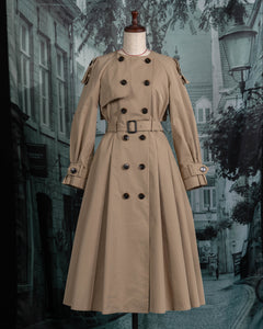 すっきりとしたノーカラーにダブルボタン、たっぷりと広がるスカートがクラシカルなデザイン。