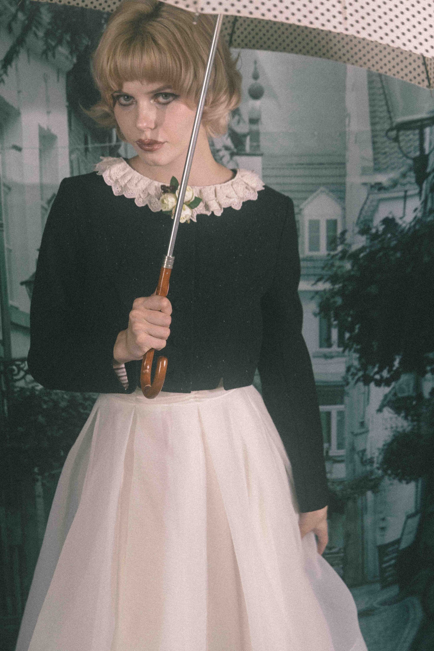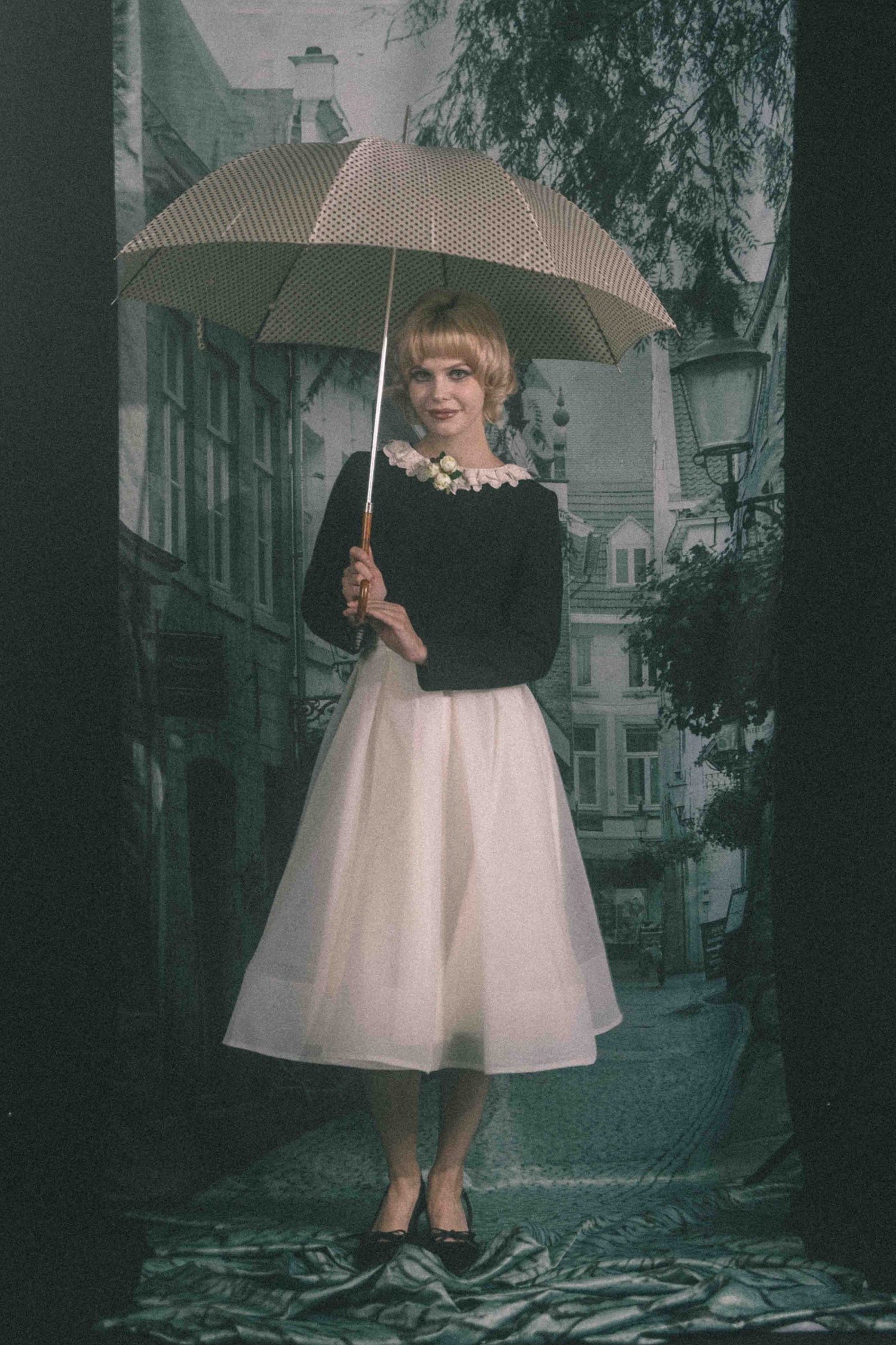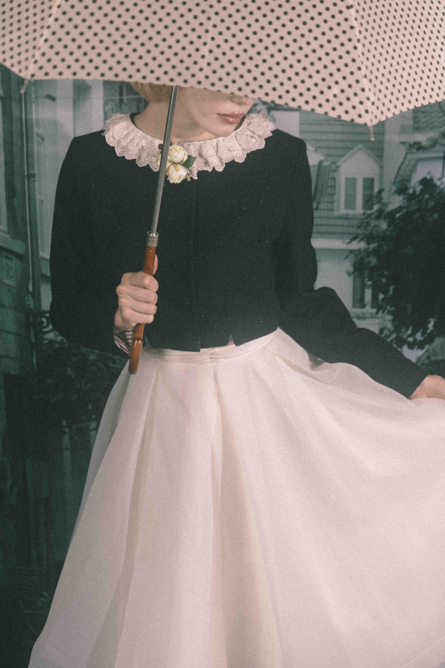 お花のコサージュが特別な日を彩る、どこか懐かしくノスタルジックな雰囲気を纏う一着です。