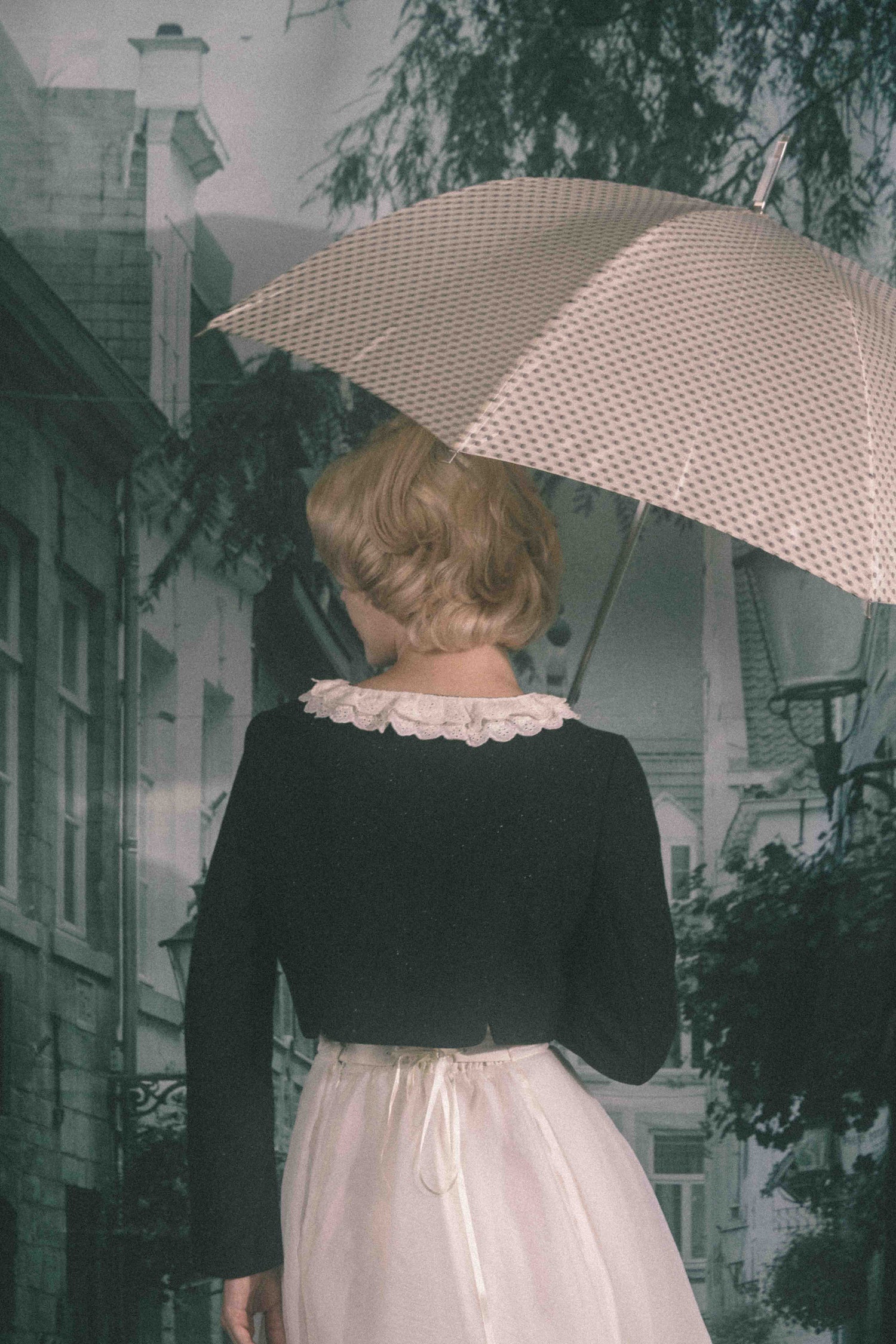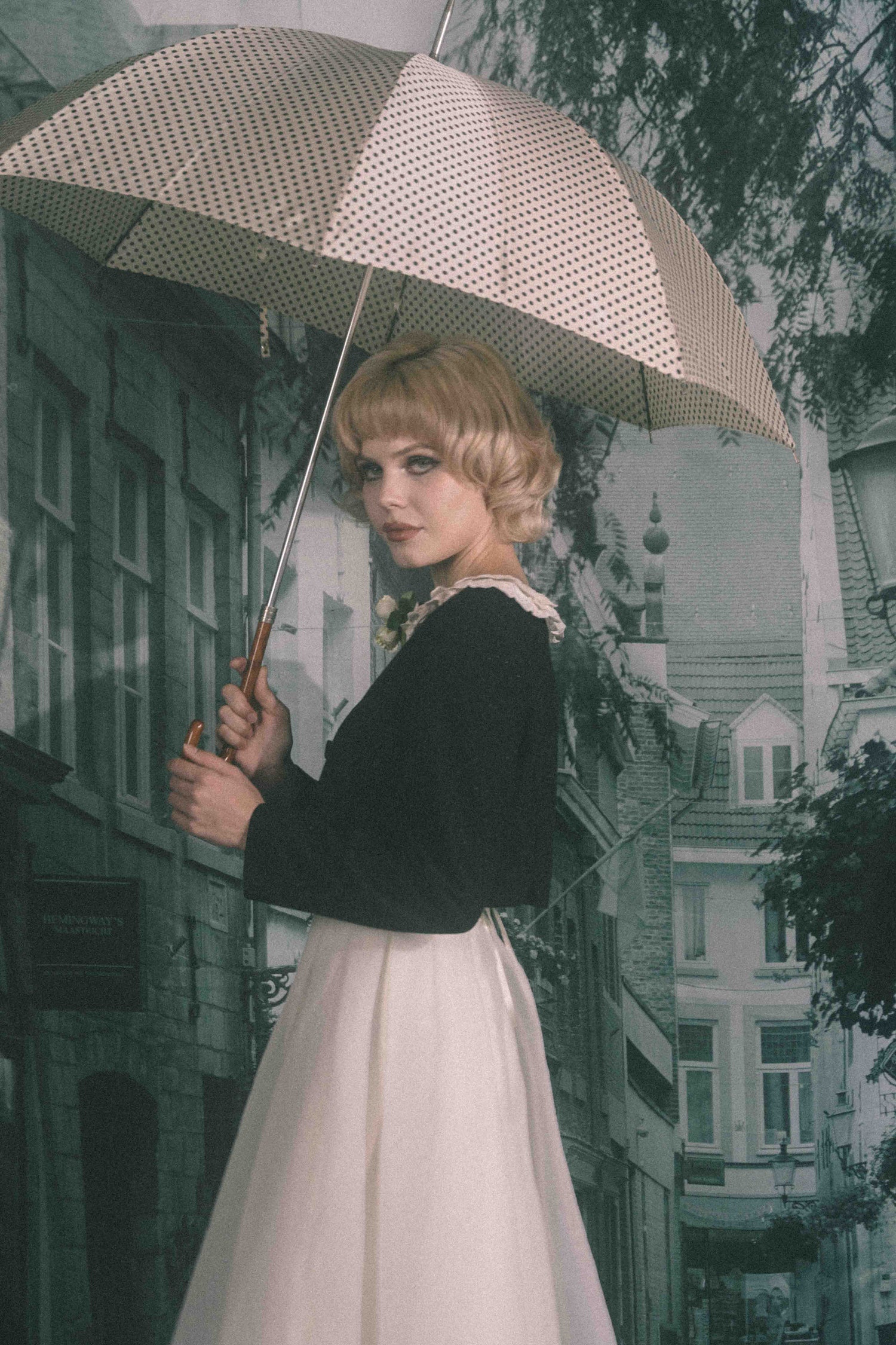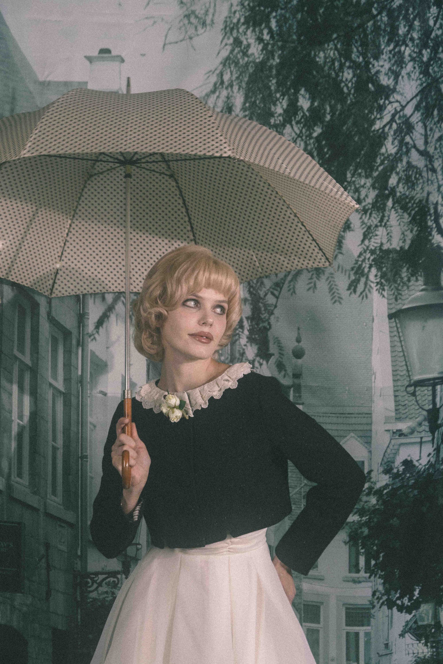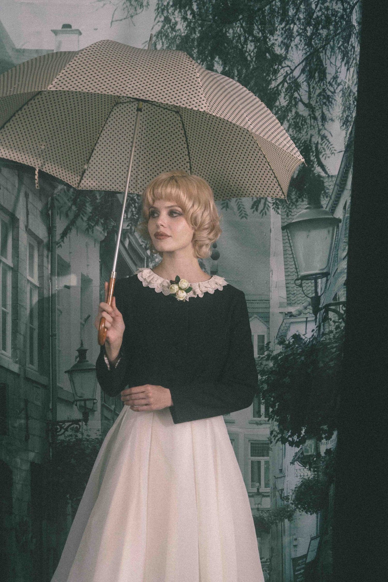 お花のコサージュが特別な日を彩る、どこか懐かしくノスタルジックな雰囲気を纏う一着です。