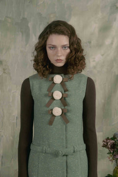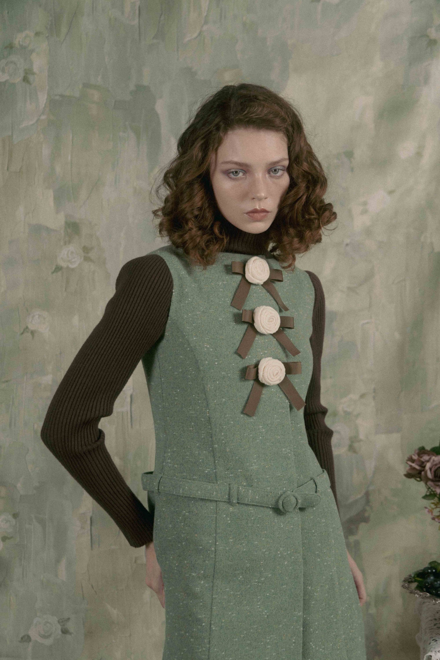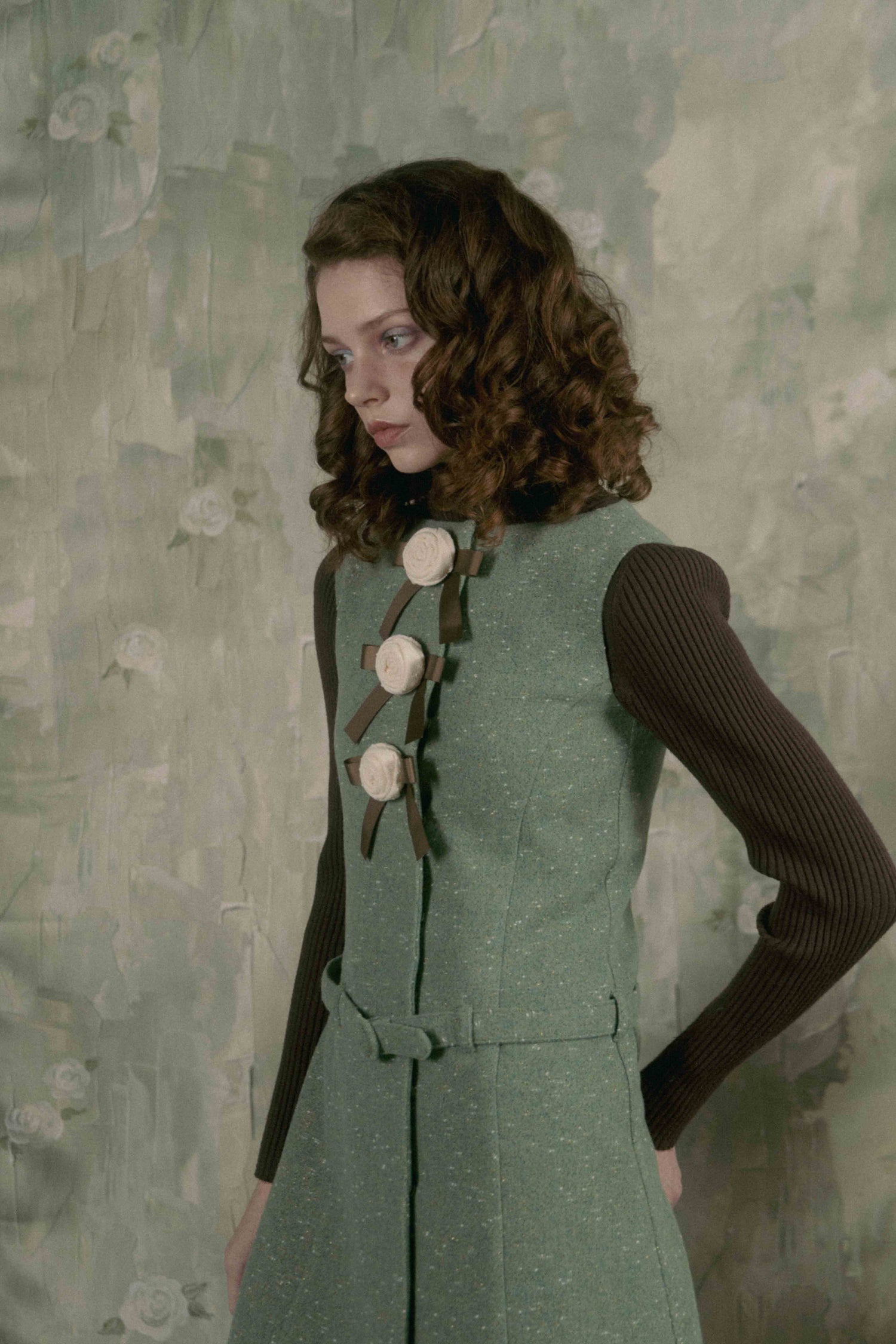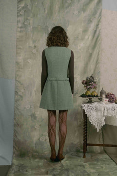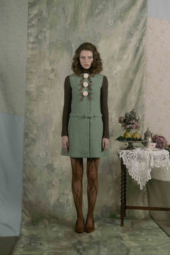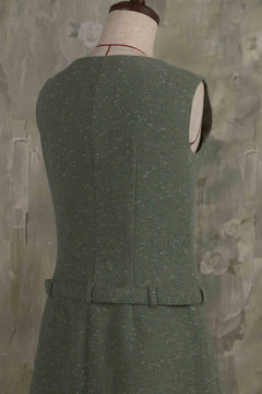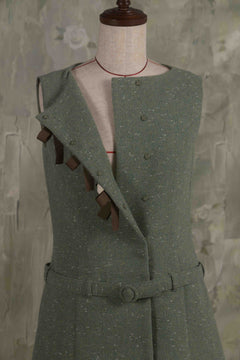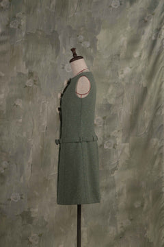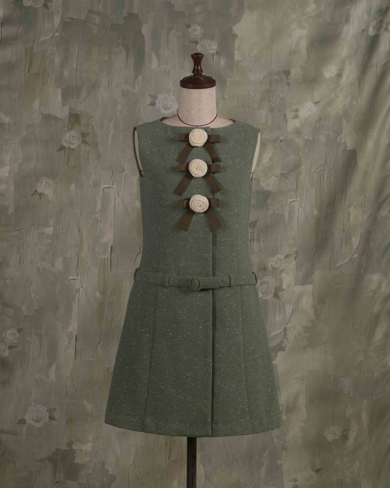 Aラインのシルエットと腰のベルトがどこかレトロなムードを漂わせています。