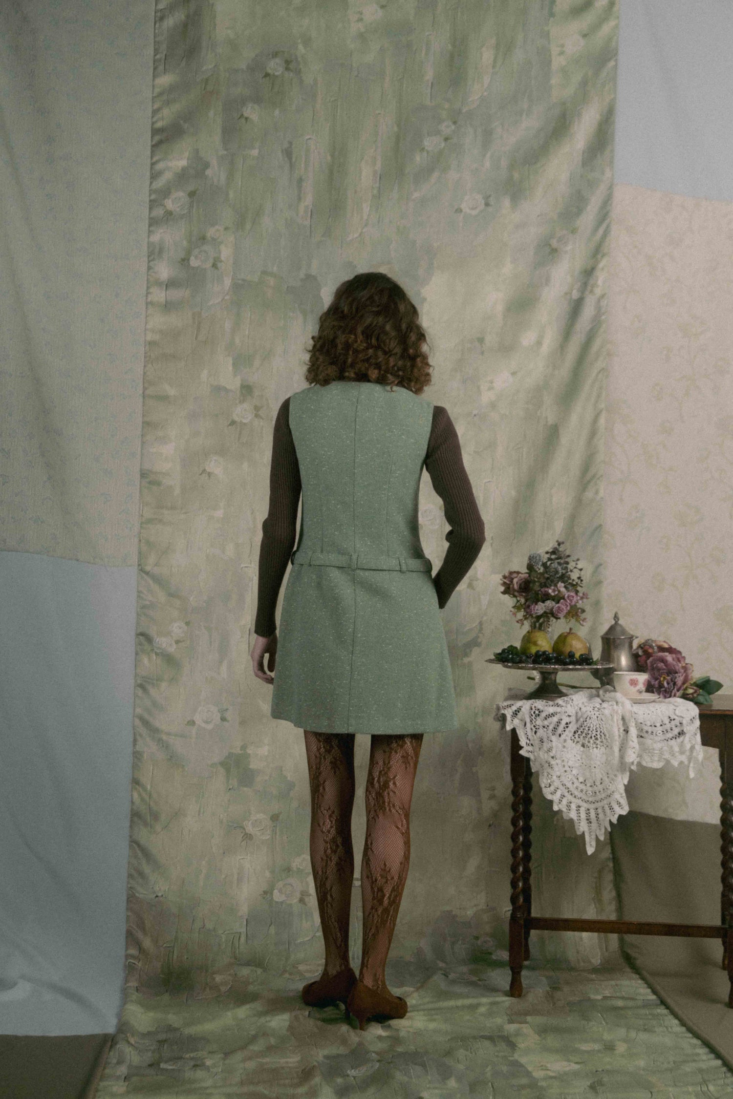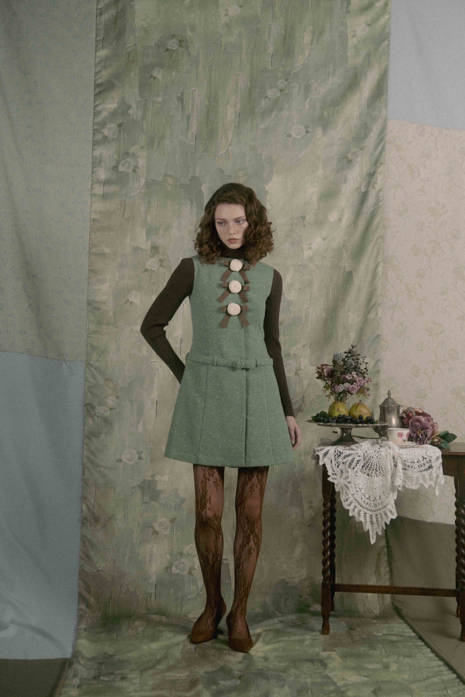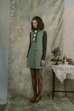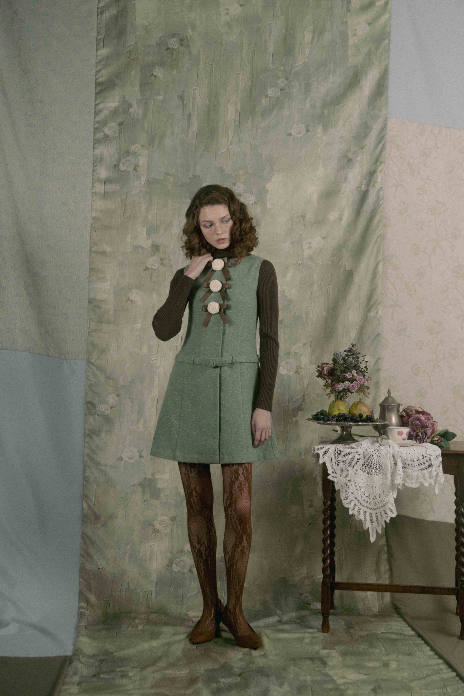 Aラインのシルエットと腰のベルトがどこかレトロなムードを漂わせています。