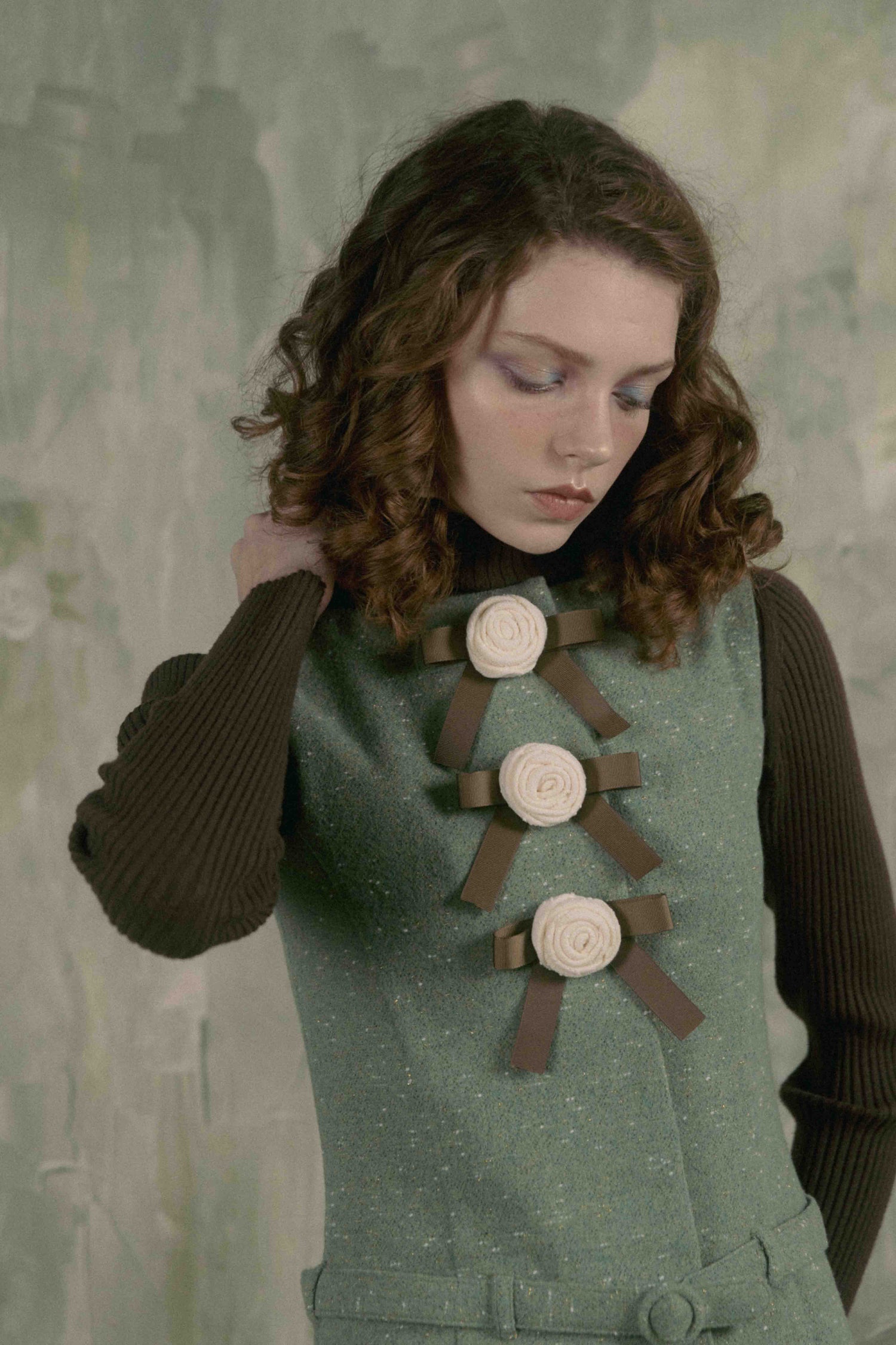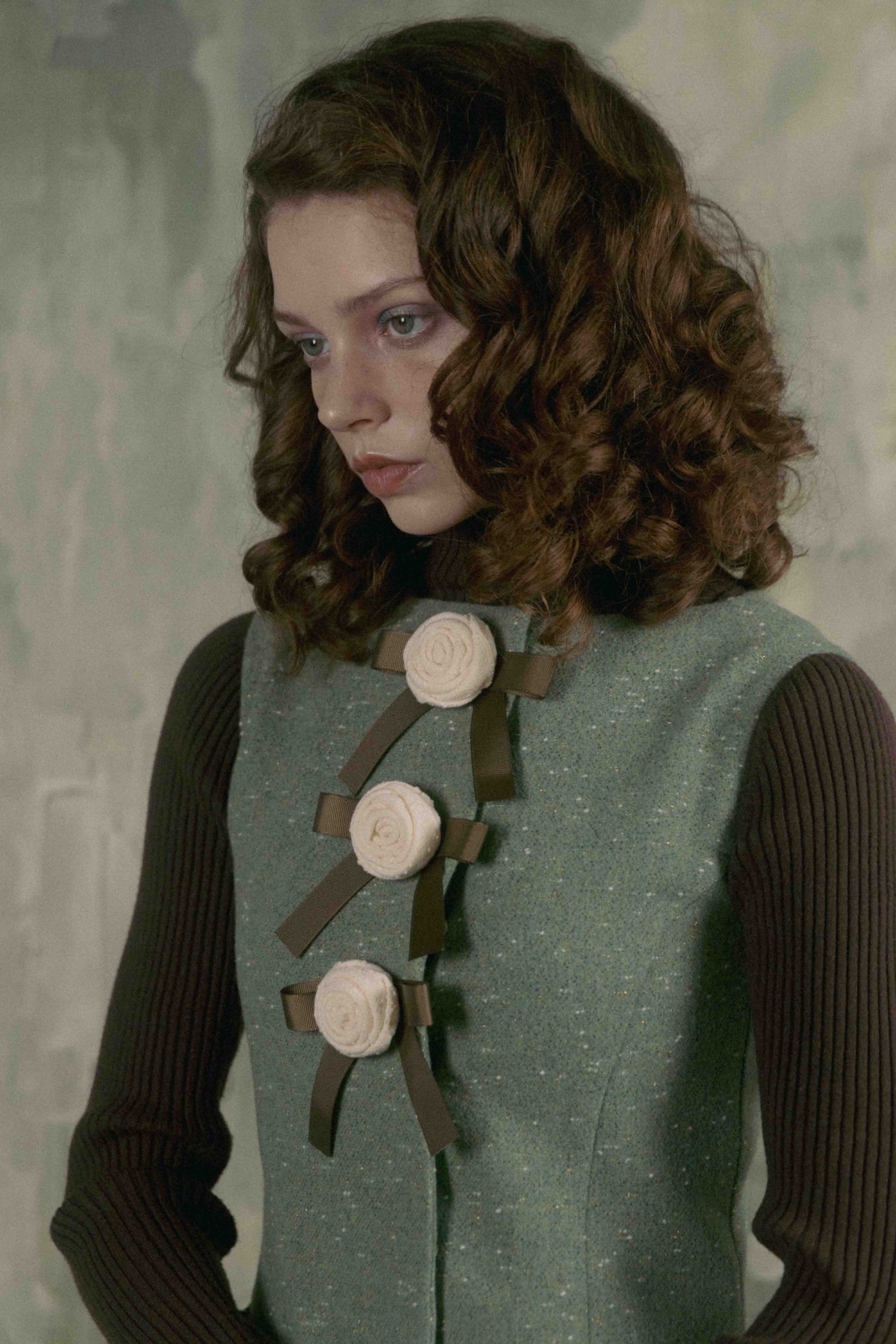 立体的なバラと、葉をイメージしたグリーンのリボンが3つ並ぶ、